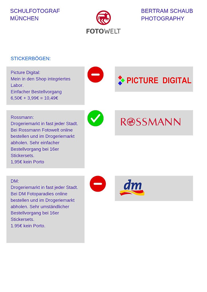 Woher bekommt man die Sticker? Die 16er-Stickerbögen können Sie online bei Rossmann für 2€ bestellen und dann in der Filiale abholen. Leider wird der Direktdruck in der Filiale nicht mehr angeboten. Für die Bestellung der 16er-Stickerbögen benötigen Sie die Datei eines Einzelfotos in Passbildform/ Portraitform, wie wir es am Fototag in Studio 2 anbieten. Die Datei können Sie vom Shop unter schaub.fotograf.de herunterladen.